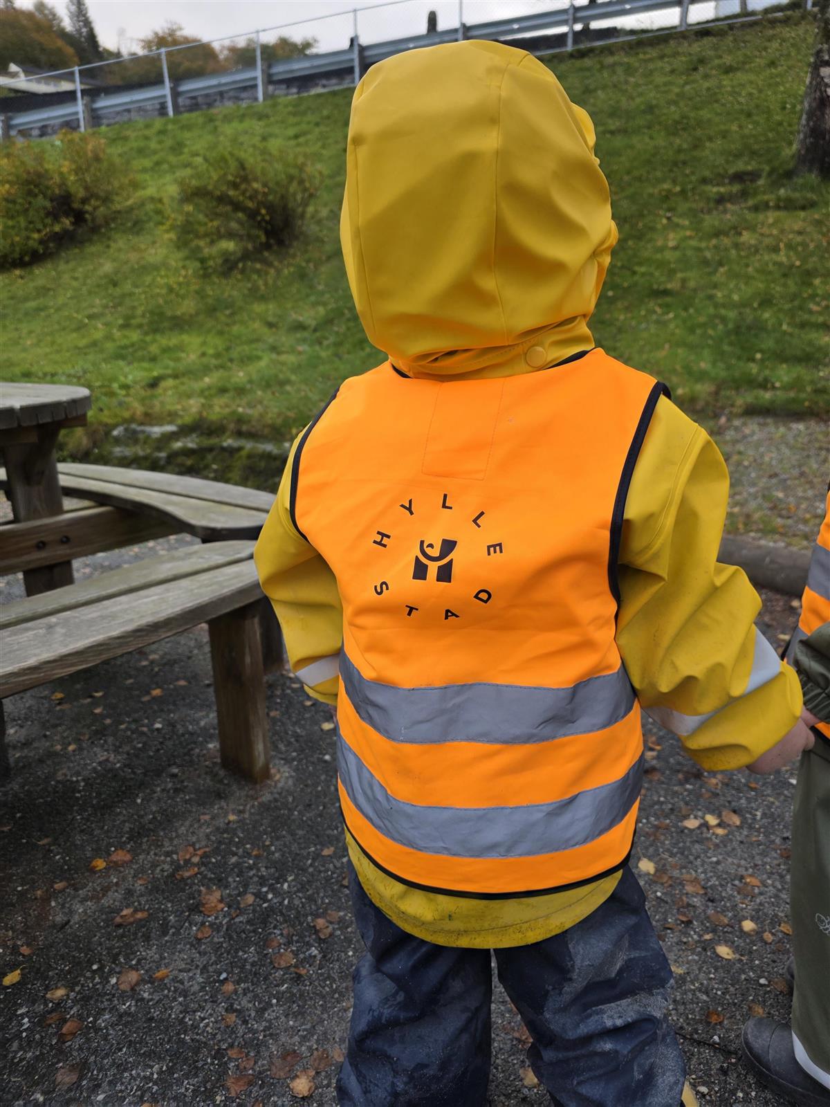 Barn med gul regnjakke og oransje refleksvest, med ryggen til. - Klikk for stort bilete Britt Marit Børve