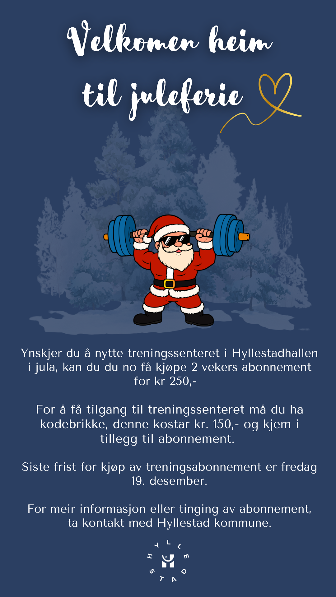 Ynskjer du å nytte treningssenteret i Hyllestadhallen i jula, kan du no få kjøpe 2 vekers abonnement for kr. 250,-